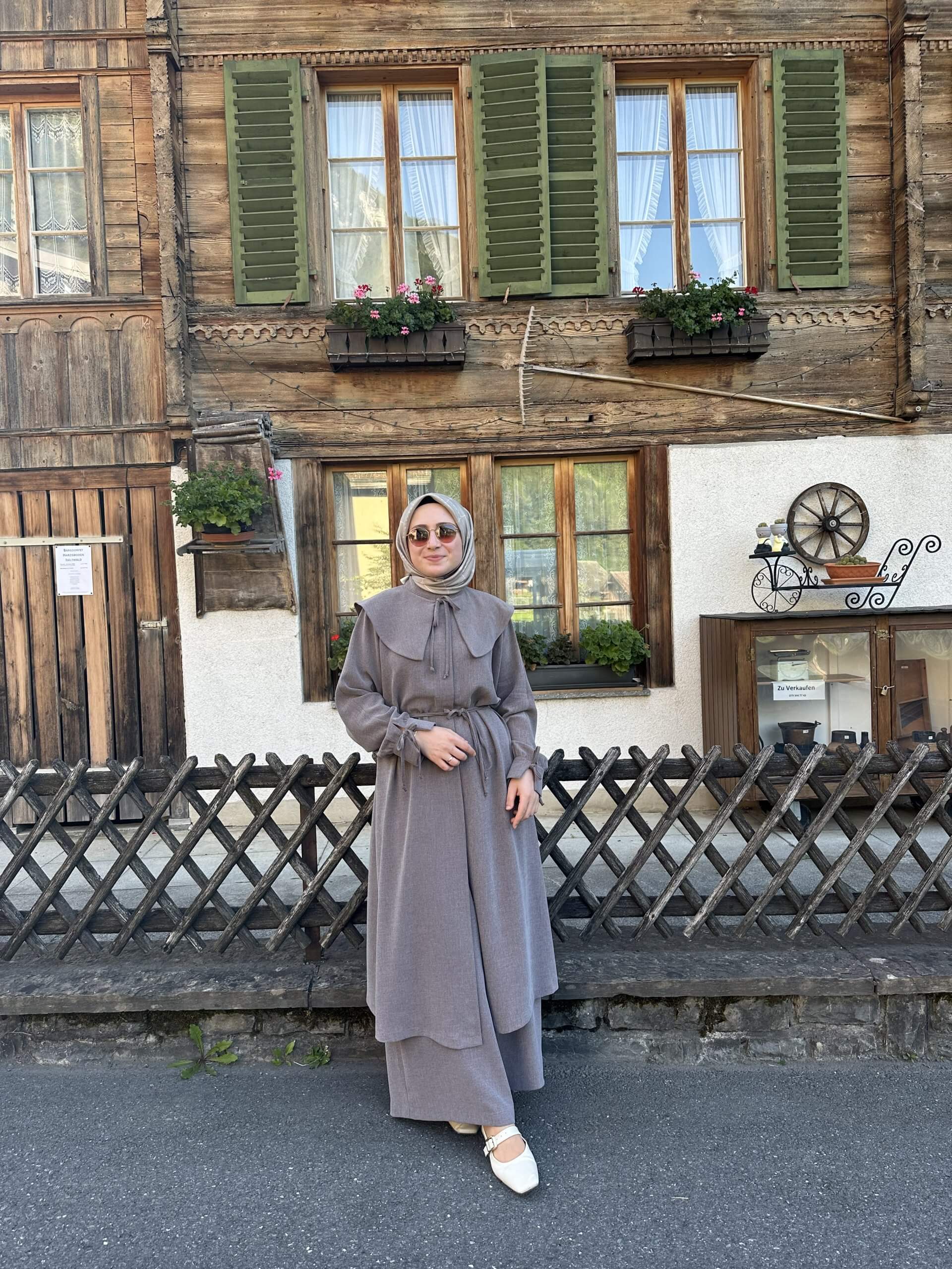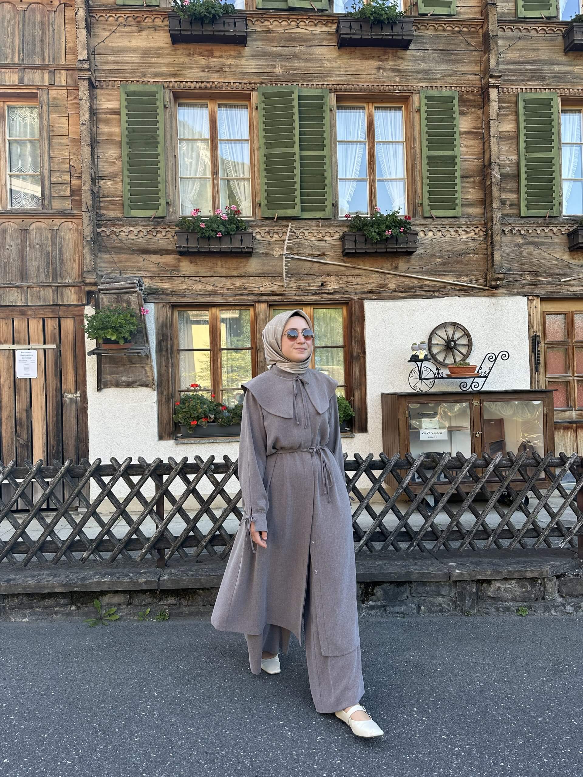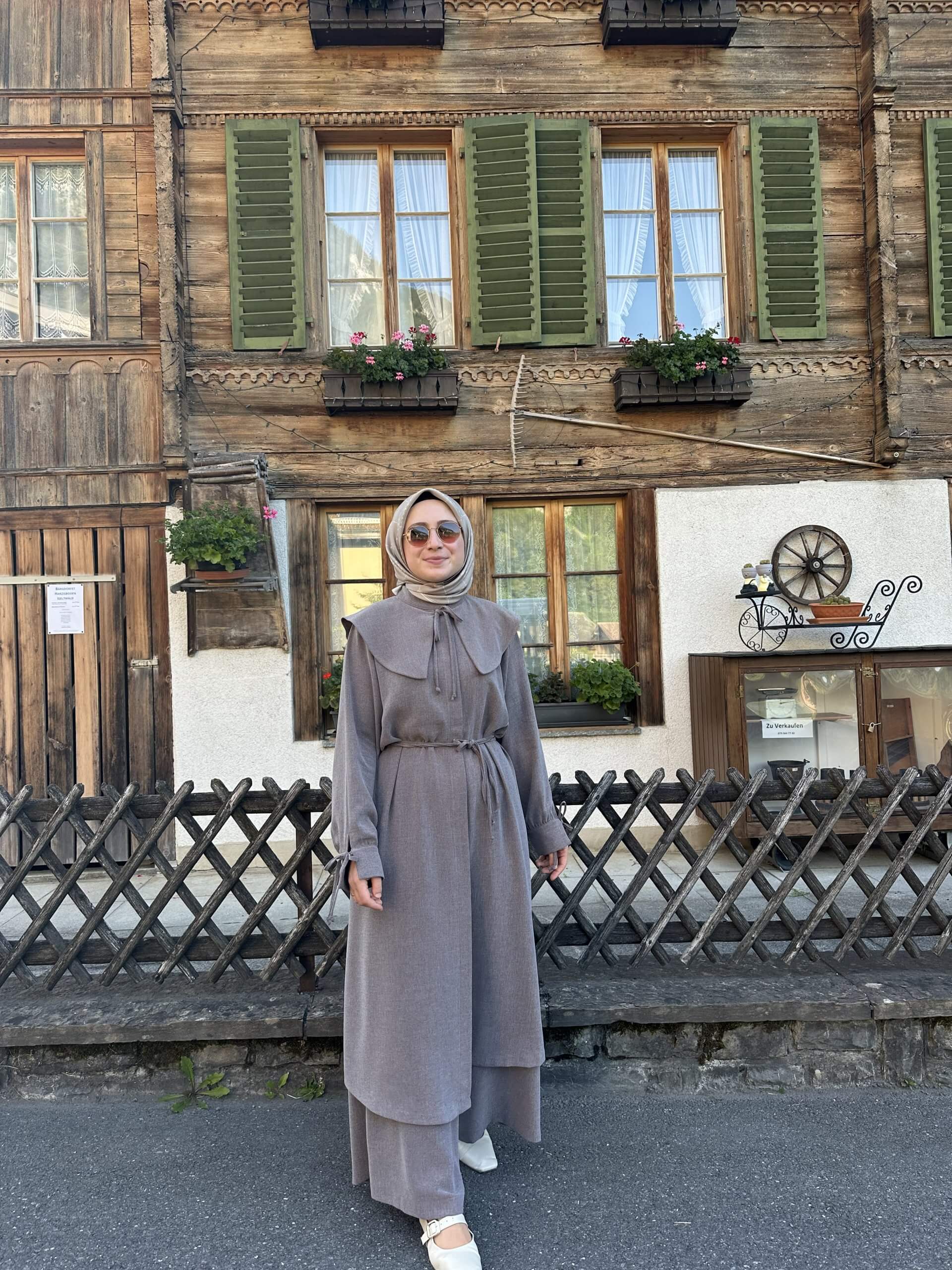 Detay: Tunik düğmeli kol manşetli pantolon beli lastikli ve bol paçalıdır.