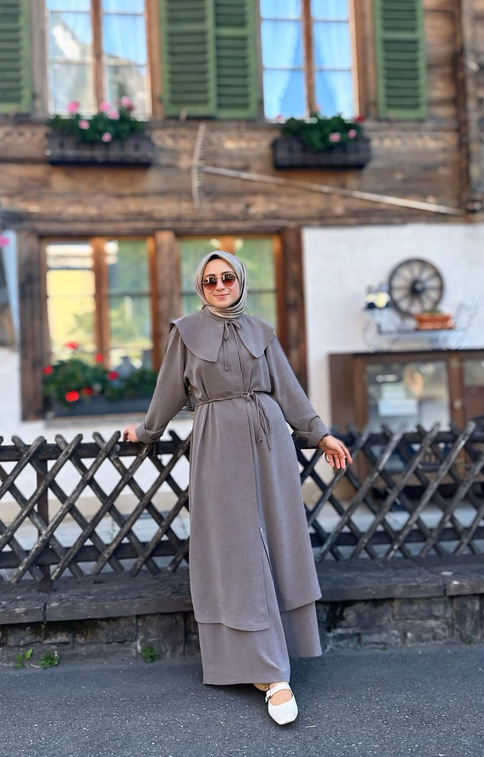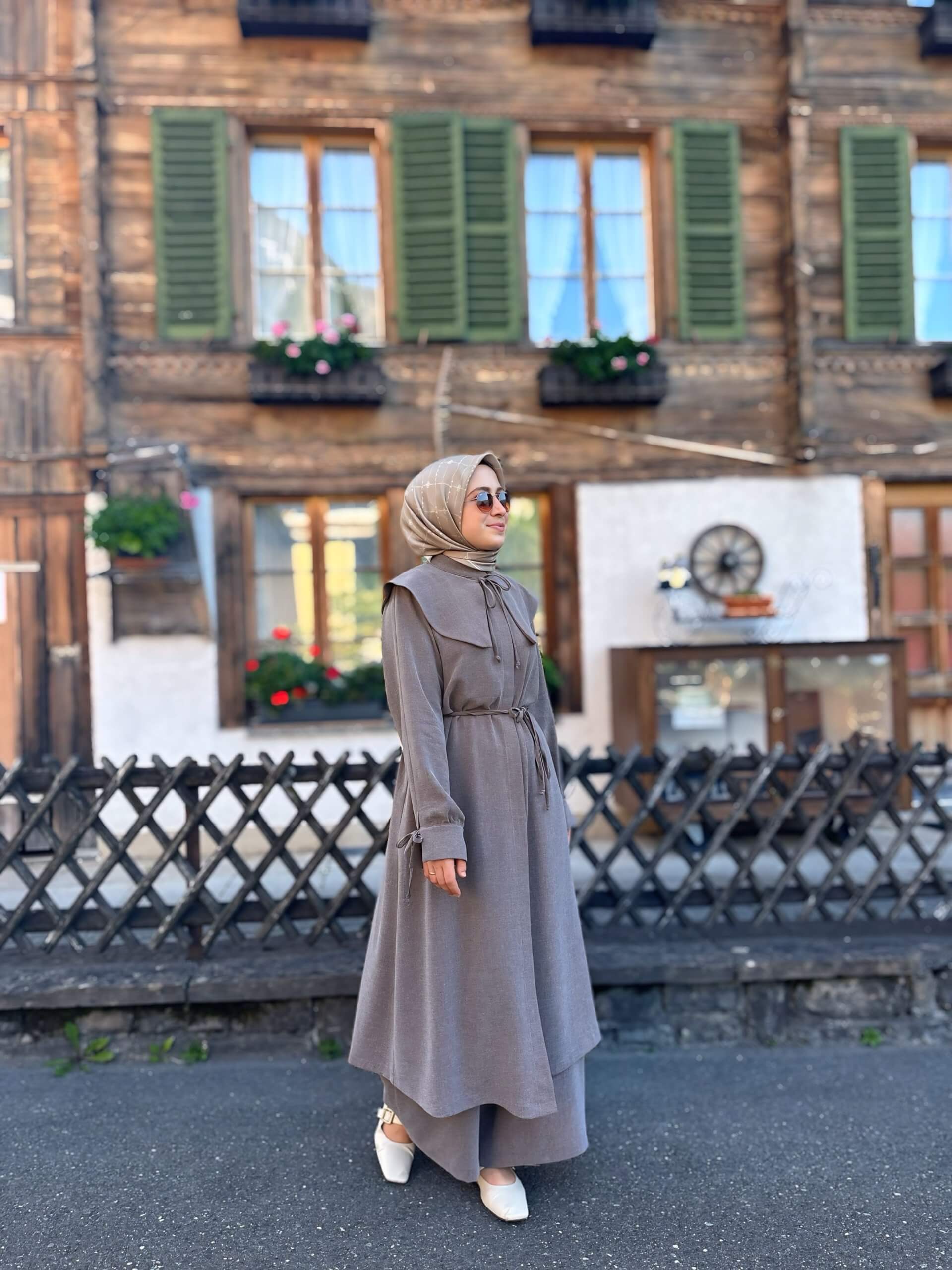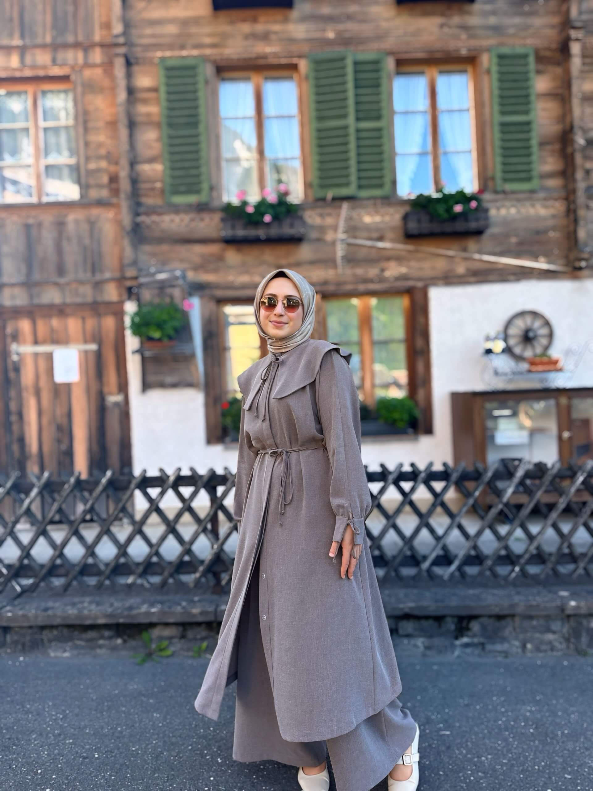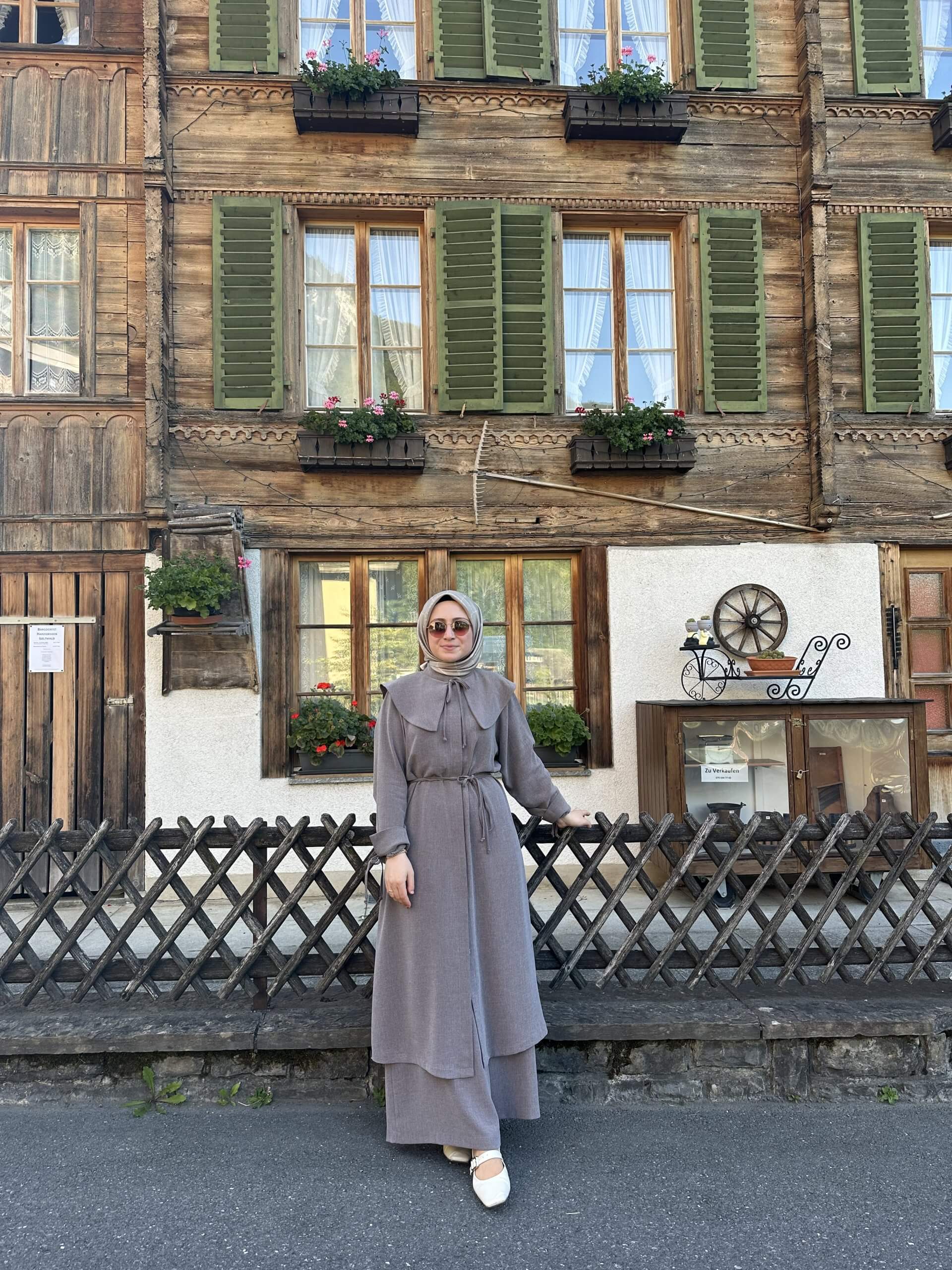Detay: Tunik düğmeli kol manşetli pantolon beli lastikli ve bol paçalıdır.
